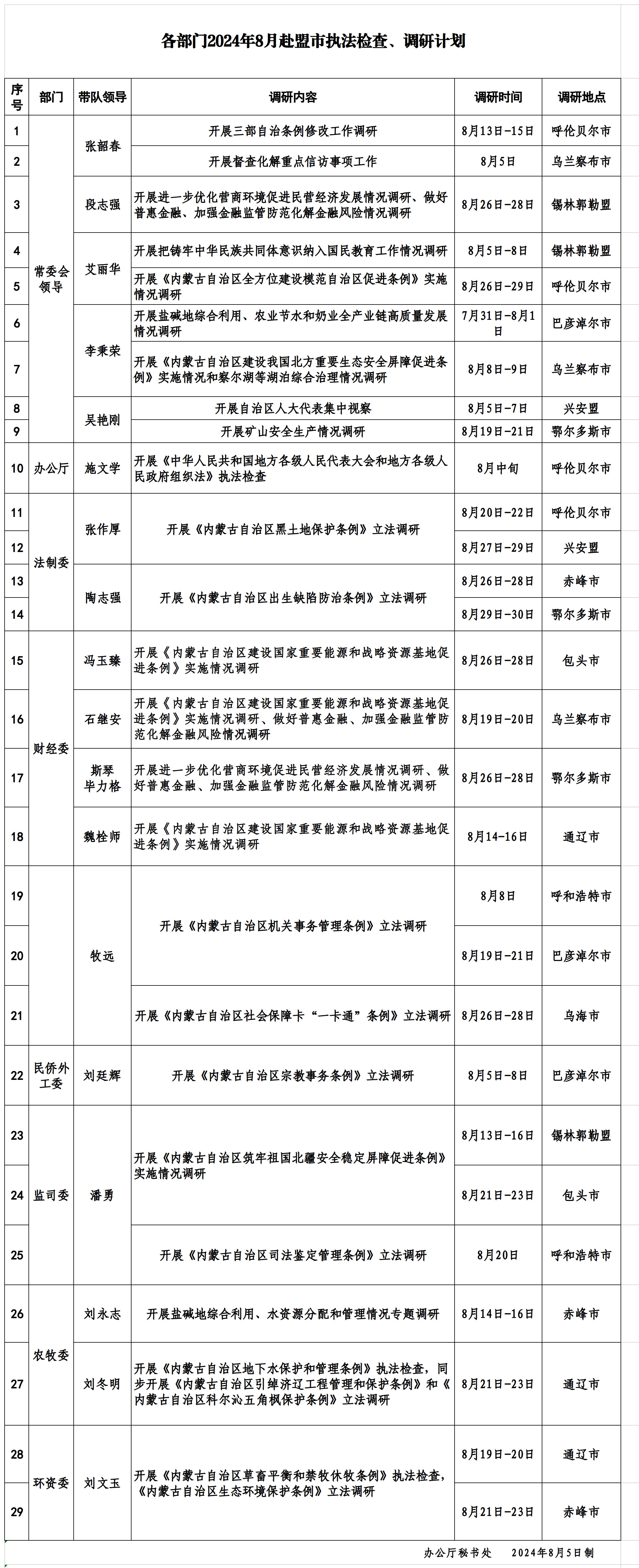 各部门2024年8月赴盟市执法检查、调研计划