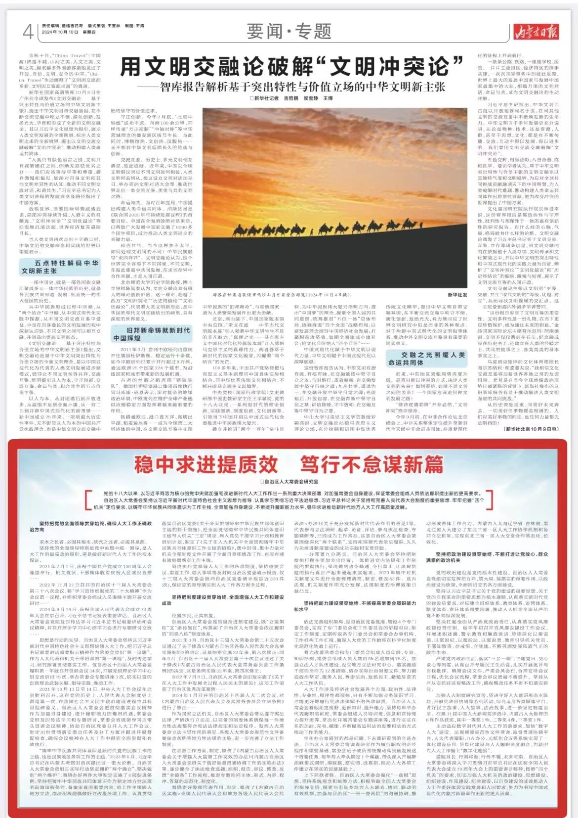 “铸牢中华民族共同体意识是新时代党的民族工作的主线,也是民族地区各项工作的主线。”2023年6月,习近平总书记在内蒙古考察时首次提出这一重大论断。自治区人大常委会党组以实际行动坚定拥护“两个确立”、坚决做到“两个维护”,围绕办好两件大事制定实施了6部促进条例,坚持把铸牢中华民族共同体意识作为制定地方性法规的前置审核条件、备案审查的重要内容,将工作主线嵌入地方立法,依法积极稳慎做好立改废各项工作。认真贯彻落实自治区党委《关于全面贯彻铸牢中华民族共同体意识主线的若干措施》,把全面贯彻铸牢中华民族共同体意识主线写入机关“三定”规定,列入党员干部学习计划和教育培训计划,制定了《关于在人大机关中全面贯彻铸牢中华民族共同体意识工作主线的措施》,集中时间、集中力量对机关全部制度文件开展了全面自查和修改工作,有形有感有效贯彻落实工作主线。